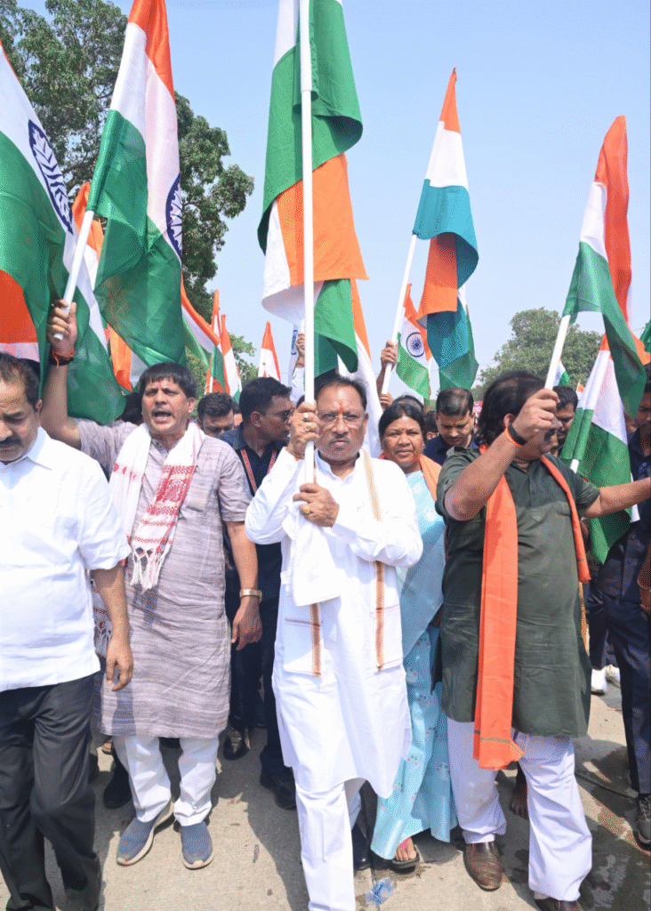 मुख्यमंत्री विष्णु देव साय के साथ जनप्रतिनिधि और बड़ी संख्या में आम नागरिक हाथ में तिरंगा लेकर यात्रा में शामिल हुए
